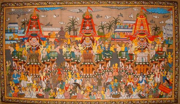 Three deities, Lord Krishna (Jagannath), Balaram and Devi Subhadra are traditionally installed on huge chariots and Devotees pull the chariots in a procession through the streets. The pathway of the chariots is usually swept by the local King.